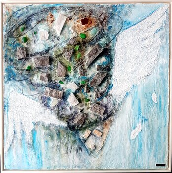 Ich habe zum Malen Natursteine verwendet – gespaltener griechischer Marmor, gespaltener blauer Marmor, Seeglas.
