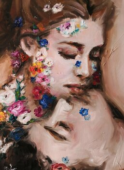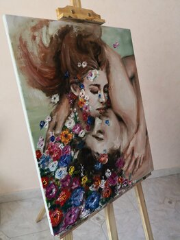 Ich habe dieses Werk geschaffen, um die vergängliche Umarmung zwischen Schönheit und Natur einzufangen, in der Gefühle in leuchtenden Farben zusammenkommen. Die Öl-auf-Leinwand-Arbeit drückt einen Tanz zwischen Realismus und Traum aus, einen intimen symbolischen Zufluchtsort: eine Hymne an das Leben und seine ewigen Blumen, die trotz ihrer flüchtigen Existenz unauslöschliche Spuren hinterlassen. Diese Leinwand bringt eine lebendige und leidenschaftliche… Energie in Ihr Zuhause.