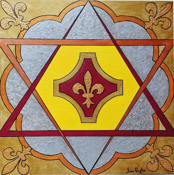 Ich habe dieses Werk geschaffen, um die Harmonie zwischen Form und Symbol zu erforschen. Mit Acrylfarben habe ich figurative, geometrische und symbolische Stile kombiniert, um Ausgeglichenheit und Stärke zum Ausdruck zu bringen. Helle Farben, durchzogen von geometrischen Formen, vermitteln ein Gefühl von Ordnung und Mystik. Jedes Element, von der goldenen Lilie bis zu den Kontrastfarben, soll positive Energie und ein Gefühl der Geborgenheit in Ihr… Zuhause bringen.