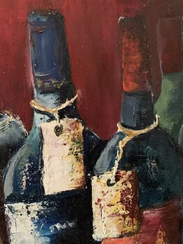Ich habe mich völlig in die Entstehung dieses Werks vertieft und mit Öl auf Leinwand eine Sammlung gealterter Weinflaschen dargestellt, von denen jede eine Geschichte von Zeit und Erinnerung erzählt. Die satten Pinselstriche und satten Farben wecken ein Gefühl der Nostalgie und zelebrieren die Schönheit des Alterns. Dieses Gemälde ist eine Hommage an Tradition und Geschichte und ich hoffe, es bringt eine Atmosphäre der Wärme und Besinnung in Ihr… Zuhause.