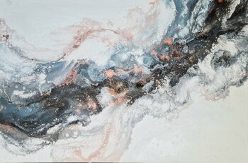 Dies ist ein originales Flow-Art-Acrylgemälde mit allen Grautönen, gemischt mit Dunkelblau, einem kontrastierenden Weiß, Kupfer und Rotgold.