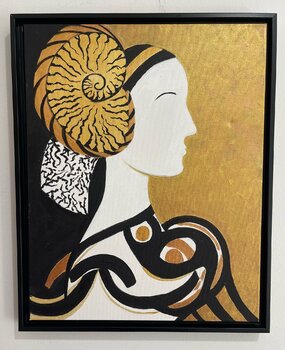 In dieser freien Version ist die Herzogin von Urbino, ursprünglich von Piero della Francesca, in Goldtönen gehalten und schmückt ihren Kopf ebenfalls mit einer Meeresschnecke.