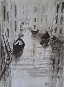 In diesem Werk habe ich versucht, die stille Magie Venedigs einzufangen – eine ruhige Ecke, in der Zeit und Raum zu verschmelzen scheinen. Die Kombination aus impressionistischen und realistischen Elementen bringt die sanfte Bewegung des Wassers und die alte Architektur zum Leben. Mit India-Tusche wollte ich die Stimmung von Ruhe und Geheimnis vermitteln, die jedes Zuhause mit einer besonderen Atmosphäre erfüllt.