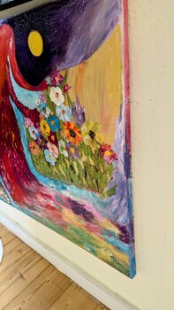 Die Komposition verbindet intensive Farben mit organischen Formen und öffnet einen Raum zwischen Landschaft und innerem Bild. Weiblichkeit erscheint hier nicht als Symbol, sondern als schöpferische Präsenz: tragend, erneuernd, bewusst.