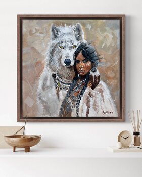 In einer lebendigen Mischung aus zeitgenössischer Kunst und zeitloser Symbolik fängt ein modernes Gemälde die starke Verbindung zwischen einer Frau und einem Wolf ein. Die Szene ist beeindruckend: Die Frau, in ein fließendes, tiefrotes Kleid gehüllt, steht selbstbewusst vor einer abstrakten Wildniskulisse. Ihr Blick ist ruhig und doch gebieterisch und strahlt eine stille Stärke aus. Neben ihr ruht der Wolf – gemalt in kräftigen Strichen in Grau und… Silber – und seine durchdringenden Augen spiegeln sowohl Loyalität als auch ungezähmte Wildheit wider.