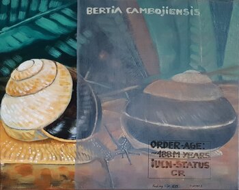 40 Gemälde für 40.000 Arten, die von der IUCN als weltweit gefährdet eingestuft werden (Stand 2021). Hier Bertia Cambojiensis (Vietnamesische Riesenschnecke), Vietnam und Kambodscha. IUCN-Status CR = vom Aussterben bedroht durch Übersammlung für den Muschelhandel (brauner Schattierungsschirm).