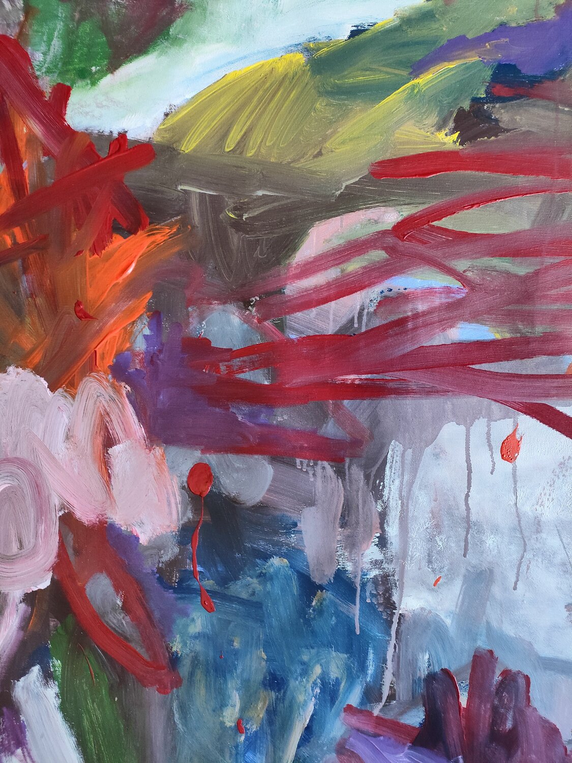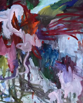 Abstraktes expressionistisches Werk mit einer dunklen Palette, hauptsächlich Rot, Lila, Rosa und Grün.