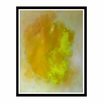 Minimalistisches Kunstwerk. Zentrale Komposition mit einem Kontrast zwischen einem warmen Gelb und einem fluoreszierenden Gelb, das im Vordergrund reliefartig überlagert ist, das Ganze auf einem unscharfen Hintergrund, diffus mit einem verblassten Gelb.