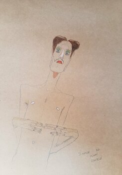 Serie von STARCK-Studien zu Egon Schiele, bestehend aus dem Porträt des Künstlers auf 50 x 65 cm großem Papier, begleitet von 3 Arbeiten auf 21 x 29,7 cm großem braunem Papier. Das Hauptwerk ist eine Mischtechnik aus einem Büstenporträt von Egon und einer komischen Collage von Achille Talon, um seiner orangefarbenen Jacke auf seinem blauen T-Shirt ein Muster zu verleihen. Die anderen kleineren Werke sind weibliche und männliche Akte von Egon Schiele,… neu interpretiert von Emily STARCK.