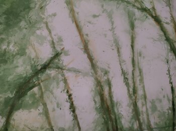 Pfad im Bergwald im Sommer. Das Gemälde ist fast monochrom. Die unendlichen Grüntöne werden ohne jegliche Grundvorbereitung auf feinkörniger Baumwoll-Leinwand dargestellt. Als wäre es eine Grafik auf Papier, aber mit der Wirkung eines natürlichen Stoffes. Das Werk ist nicht gerahmt, da es sich aufgrund seiner Größe auch zum Aufkleben an eine Wand oder einen Holzträger eignet sowie wie ein herkömmliches Gemälde gerahmt und aufgehängt werden kann.