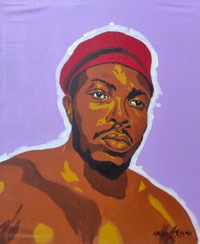 Dieses Gemälde verdeutlicht die Macht persönlicher Symbole und die Bedeutung kultureller Zeichen. Der starke Kontrast zwischen den tiefen Hauttönen und dem sanften, lavendelfarbenen Hintergrund unterstreicht die unmittelbare Präsenz des Dargestellten und zwingt den Betrachter, ihm direkt in die Augen zu sehen. „Ajibolas rote Baskenmütze“ ist ein Bekenntnis zur persönlichen Stärke und feiert den Mann, der seine Überzeugungen und seinen Stolz bewusst zur Schau trägt.