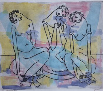 Dieses mit Drucktechniken erstellte und in Tinte auf Papier getauchte Werk fängt die Essenz menschlicher Verbindung mit vereinfachten Strichen und sanften, aber ausdrucksstarken Farben ein. Jede mit fließenden Linien umrissene Figur stellt unterschiedliche Facetten von Emotionen und Selbstbeobachtung dar, die in einem stillen Dialog miteinander verflochten sind, der Tiefe und Verletzlichkeit widerspiegelt. Wenn man dieses Stück in ein Zuhause bringt,… entsteht eine Atmosphäre der Besinnung und Ruhe und lädt den Betrachter ein, über die Komplexität menschlicher Beziehungen und die Schönheit ausdrucksstarker Einfachheit nachzudenken.