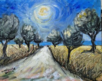 In diesem Ölgemälde wollte ich die lebendige Essenz der Natur auf dem Pfad zwischen den Olivenbäumen einfangen. Mit intensiven Farben und kräftigen Pinselstrichen drückte ich tiefe Emotionen aus. Das einhüllende Sonnenlicht erhellt den Weg und vermittelt ein Gefühl der Hoffnung und des Neubeginns. Diese vitale Energie in Ihr Zuhause zu holen bedeutet, sich jeden Tag auf eine Reise des Friedens und der inneren Stärke zu begeben.
