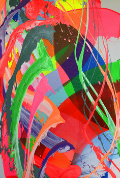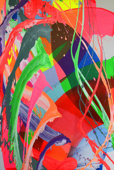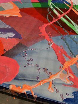 Im Kontrast dazu steht die energiegeladene Spin-Art-Technik, mit der die vorderen, dynamischen Farbspuren… aufgetragen wurden. Ein spezieller Eimer mit sechs Farbkammern wurde an einem Seil befestigt und über die Leinwand geschwungen – die Farben entfalten sich in spontanen Bahnen, Tropfen und Linien und erzeugen ein lebendiges Geflecht aus Bewegung und Intensität.