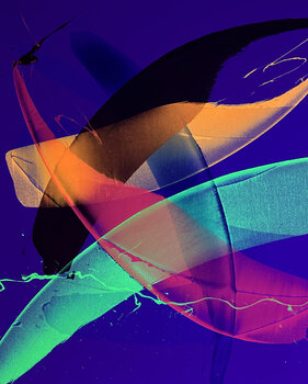 Leuchtende Neonfarben, die unter Schwarzlicht intensiv zu strahlen beginnen, verstärken den Eindruck von Bewegung… und Energie. Das Bild wirkt dadurch fast lebendig – ein Spiel aus Licht, Kraft und rhythmischer Harmonie.