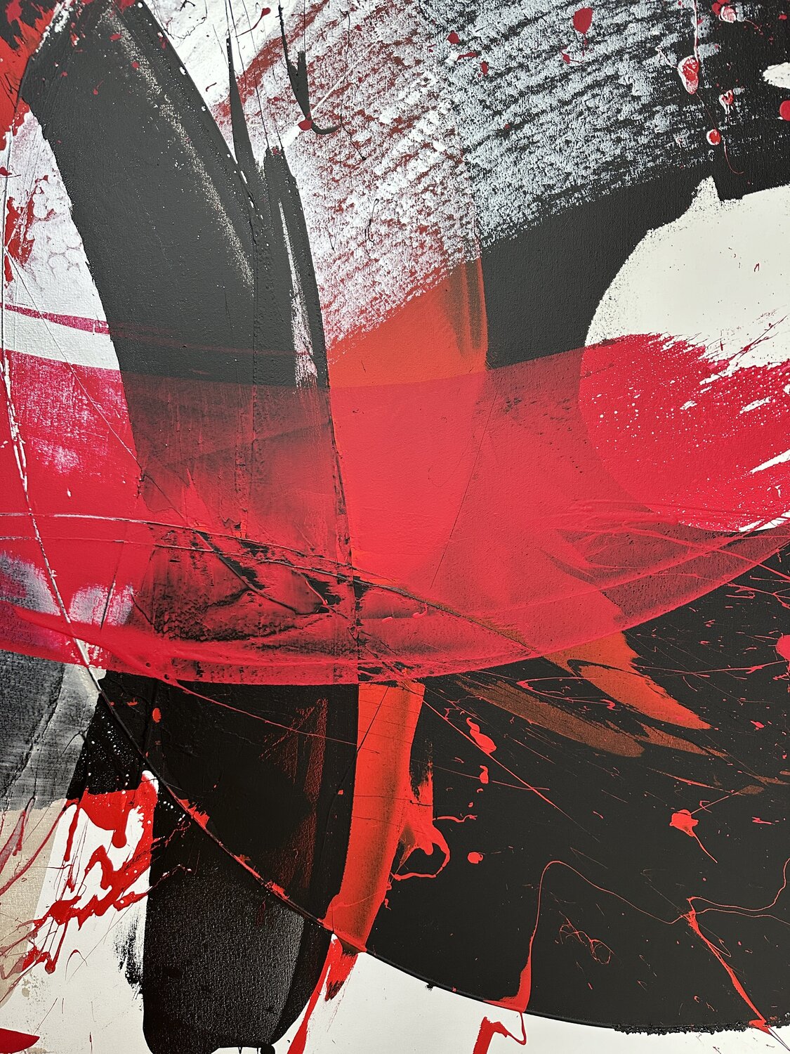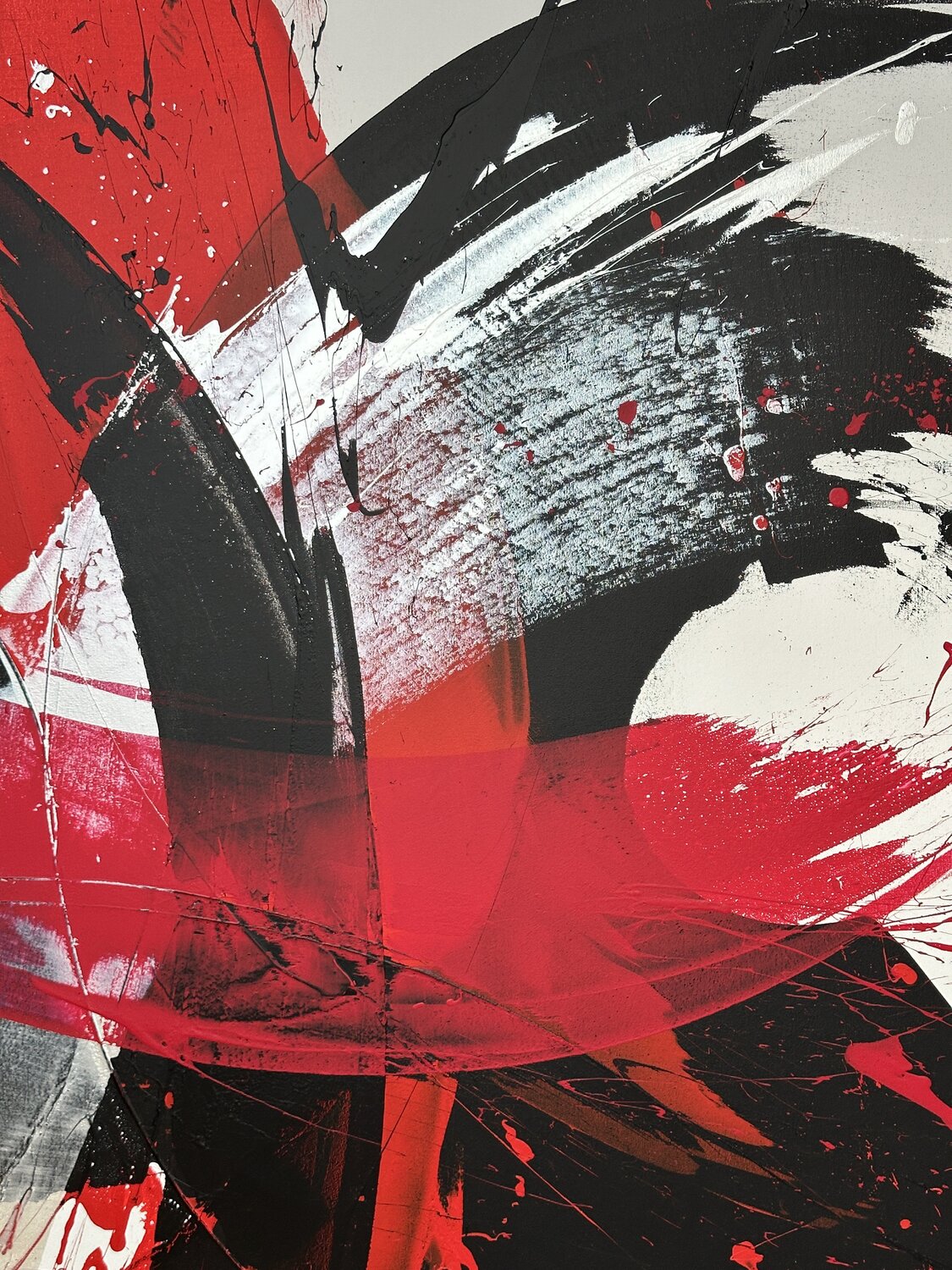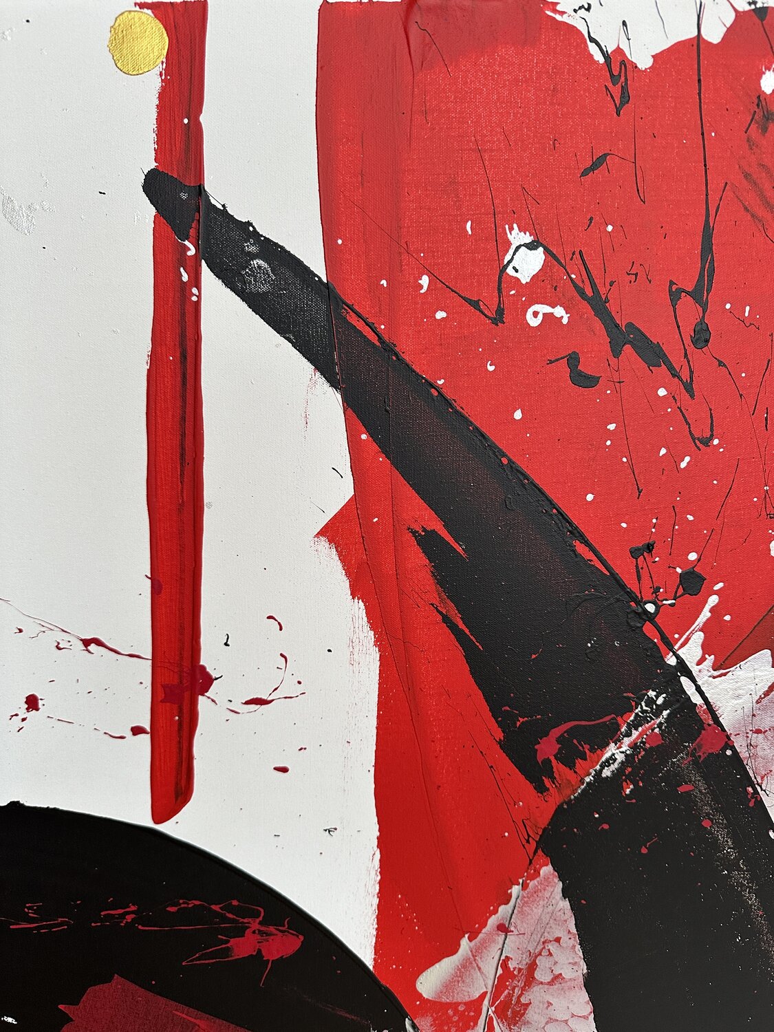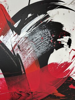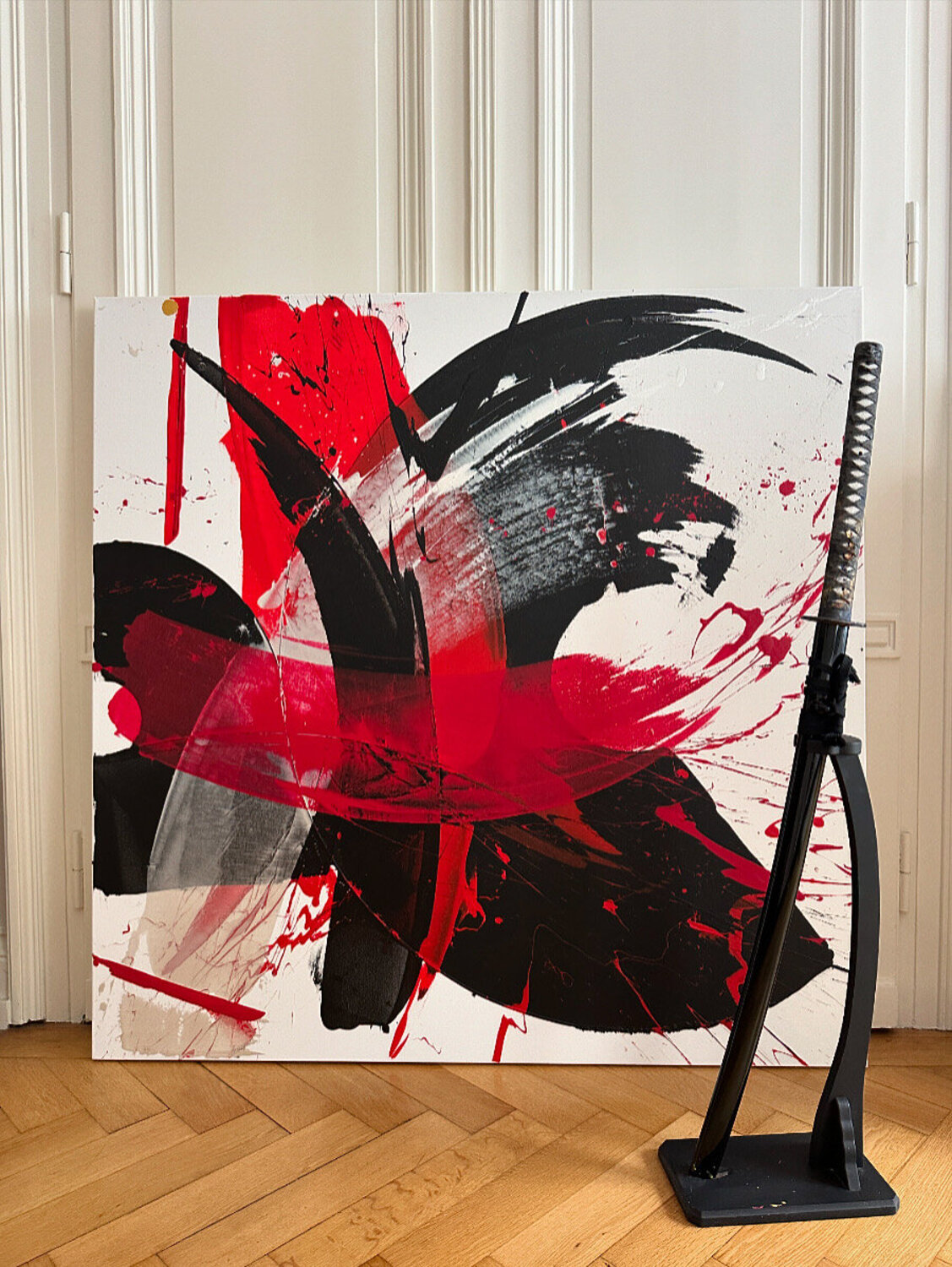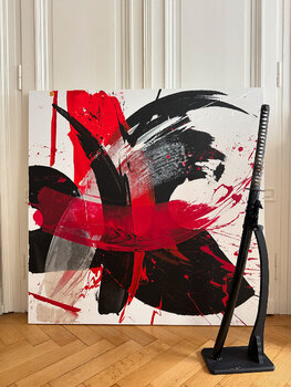 Dieses außergewöhnliche Kunstwerk wurde mit der kraftvollen Eleganz eines Samuraischwertes – eines Katana – erschaffen. Die geschwungenen Linien und dynamischen Überlagerungen entstehen durch präzise, energiegeladene Bewegungen, die dem Werk eine einzigartige Mischung aus Stärke und Leichtigkeit verleihen.