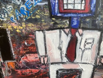 Ich habe dieses Werk mit purer Energie und kraftvollem Kontrast geschaffen und dabei Naivität und Expressionismus miteinander verbunden. Die lebendigen Gesichter fangen die menschliche Dualität ein, während die leuchtenden Farben und abwechslungsreichen Texturen intensive Dynamik erzeugen. Dieses Gemälde drückt gleichzeitig Chaos und Komplizenschaft aus und ist ideal, um Ihrem Raum Leidenschaft und Vitalität zu verleihen.