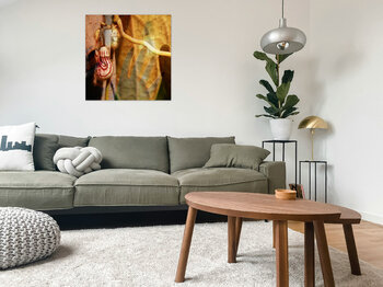 Eine sanfte Hand streichelt das goldene Licht, als schwebte sie in einem Traum zwischen Fleisch und Natur. Dieses weibliche Porträt verschmilzt mit einer seltsamen Blume samtiger Kurven in einem Spiel der Überlagerung, in dem das Menschliche mit dem Pflanzlichen verschmilzt.