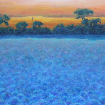 Eine geheimnisvolle Landschaft, die eine Hommage an die Bretagne darstellt. Ein blaues Feld aus einer Vielzahl von Hortensienblüten, das unsere gewohnte Wahrnehmung stört. Sind wir am Boden oder unter Wasser? Blumen, Schwämme oder Korallen – alles ist möglich in diesem imposanten Vordergrund, der fast drei Viertel der Fläche einnimmt. Der Vordergrund erforderte viel Arbeit, um Tiefe und Präsenz zu erreichen. Über diesem imaginären Feld können wir… den Golf von Morbihan in der untergehenden Sonne sehen und die kleine Silhouette eines traditionellen Segelboots erkennen. Eine zeitlose Kreation, die ich vor vielen Jahren begonnen und im Jahr 2023 fertiggestellt habe. Ein surrealer Raum, der Ihnen Flucht und Gelassenheit bringt.