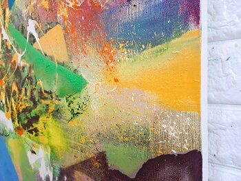 „Nature and...Energy 1810011“ ist ein großes abstraktes Gemälde, das die dynamische Energie der Natur einfängt. Intensive Farben wie Blau, Grün, Gelb und Rosa verschmelzen auf der Leinwand und erinnern an die Elemente Himmel, Wasser, Wald und Blumen. Die freien Linien des Künstlers und der Farbauftrag verstärken das Gefühl ständiger Veränderung und Bewegung.