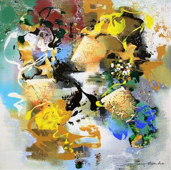 Inspiriert von den abstrakten Mustern der Natur, vermittelt… dieses moderne Kunstwerk ein Gefühl von Vitalität. Gelb-, Grün- und Blautöne verschmelzen und suggerieren Leben und ständige Bewegung. Farbspritzer und -flächen fangen die flüchtige, augenblickliche Qualität der Energie ein, während geschichtete Texturen den Lauf der Zeit, die Sedimentation und den fortwährenden Schöpfungsprozess symbolisieren.