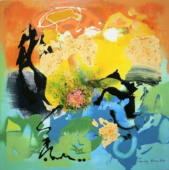 Das Gemälde zeigt im oberen Bereich eine orange-gelbe Fläche, die Licht, Wärme und natürliche Energie symbolisiert und eine kraftvolle Ausstrahlung erzeugt. Darunter verkörpert ein vielfarbiger Bereich abstrakt die Entstehung von Leben und verbindet das Erblühen von Blumen mit dem Atmen der Natur. Blaue und grüne Töne im unteren Bereich repräsentieren Erde und Wasser, die das Leben erhalten, und verbinden sich mit der intensiven Energie darüber zu einer harmonischen, kreisförmigen Struktur.