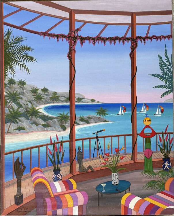 In dieser Arbeit wollte ich die morgendliche Ruhe eines Wohnzimmers einfangen, das sich zu einem wunderschönen tropischen Strand hin öffnet. Mit Acryl wegen seiner leuchtenden Farben malte ich eine friedliche Aussicht von einem Pavillon aus, umrahmt von Palmen und mit Blick auf das türkisfarbene Meer, auf dem sich Segelboote tummeln. Bunt gestreifte Sofas und exotische Details rufen eine freudige Flucht hervor. Dieses Gemälde verkörpert Flucht und… Ruhe und lädt zu einem Moment der Entspannung in der Privatsphäre eines erhaltenen Paradieses ein.