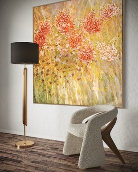 Dieses Kunstwerk entstand an einem ruhigen Herbstnachmittag, als der Künstler die blühenden Blumen inmitten des Grases einfing, getaucht in das sanfte Leuchten des umgebenden Sonnenlichts. Inspiriert von den allmählichen Übergängen von Farbe und Licht in der Natur, verwendete der Künstler zarte Pinselstriche, um die schwankenden Blüten in der Herbstbrise darzustellen. Goldene Farbtöne verflechten… sich mit den orangeroten Blütenständen und stellen die Wärme und Anmut der wechselnden Jahreszeiten dar. Das gesamte Gemälde strahlt eine sanfte, lyrische Stimmung aus, als würde es eine ruhige Abschiedsmelodie für den nahenden Winter komponieren.