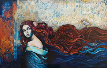 In diesem lebhaften Ausdruck von Emotionen und traumhaftem Surrealismus habe ich die rätselhafte Verbindung zwischen Mensch und Natur eingefangen. Die fließenden roten Locken imitieren die wilden Meereswellen und symbolisieren die wilde, aber anmutige Kraft im Inneren. Die Möwe, die zart thront, spricht von flüchtigen Momenten der Interaktion mit der Wildnis. Dieses Stück verkörpert den wunderschönen Tanz zwischen dem Heiteren und dem Ungezähmten… und soll in Ihrem Raum Kontemplation und ein Gefühl des Staunens hervorrufen.