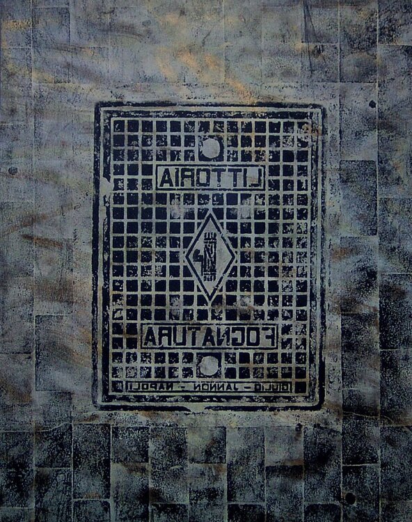 Die Arbeit ist Teil eines umfassenderen Forschungsprojekts, das gemeinsam mit Carmelo Rago, einem früh verstorbenen Kollegen und Weggefährten, durchgeführt wurde und sich ganz dem Gullydeckel als urbanem Möbelstück und Simulakrum der Gegenwart widmet. Dieser „Deckel“, positioniert als Schwelle zwischen der Oberflächenwelt, in der sich das menschliche Leben entfaltet, und der unterirdischen Welt, in der die für ihr Funktionieren notwendigen „biologischen… Systeme“ verborgen sind, zeugt zugleich von Ort und Zeit, in der er sich befindet. Mittels einer vom Holzschnitt abgeleiteten Löffeldrucktechnik zielt die Gesamtforschung darauf ab, eine Art Inventar von Gullydeckeln zu erstellen, die zu Ikonen der Gegenwart erhoben werden und uns dazu auffordern, vorsichtig zu sein, worauf wir treten.