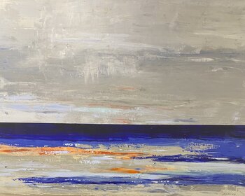 Eine Horizontlinie lockt Sie über einem schiefergrauen Himmel mit einem Blau, das nur darauf wartet, zum Vorschein zu kommen. Die Sonne steht tief und verleiht dem Grau einen Orangeton. Unterhalb des Horizonts das Meer, das die schieferfarbenen Farben des Himmels annimmt und sich bei Sonnenuntergang verdunkelt. An der Oberfläche leuchtet es rot. Die Harmonie der Farben ist großartig.