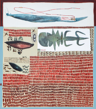 In diesem Werk wollte ich die rohe und geheimnisvolle Essenz der primitiven Natur einfangen, eine Hommage an instinktives Leben und archaische Formen. Die Farben und Symbole vibrieren mit einer uralten, fast rituellen Energie und nehmen den Betrachter mit auf eine Reise durch die Zeit. Dieses Gemälde bringt lebendige Kraft in Ihren Raum, lädt zur Kontemplation ein und vermittelt eine tiefe Verbindung zu unseren Wurzeln. „Das Land der Eidechse“ bezieht… sich auf ein Totemtier der Kanak-Kultur, den reptilartigen Wächter von Häusern und wilden Umgebungen, dessen Heiligsprechung an die Vorfahren erinnert und auch einer Yamswurzelart ihren Namen gibt, die ebenfalls zeremoniellen Zwecken dient.