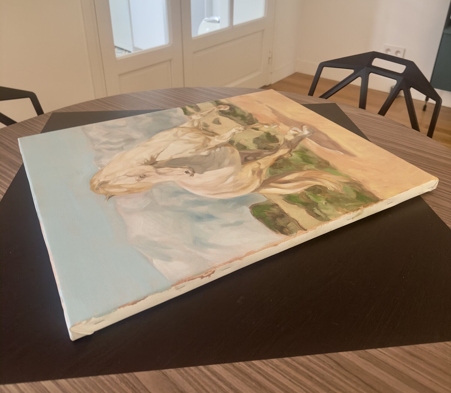Dieses Gemälde fängt die kraftvolle Anmut und die temperamentvolle Energie eines Pferdes in Bewegung ein. Mit Ölfarben wollte ich jedem Muskel und jedem Schatten Leben und Dynamik verleihen und so Freiheit und Stärke betonen. Es ist eine Hommage an die Schönheit und wilde Vitalität der Natur und wird jeden Raum mit einer dynamischen, erhebenden Energie erfüllen, die Aufmerksamkeit fesselt und Ehrfurcht einflößt.