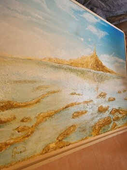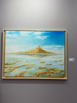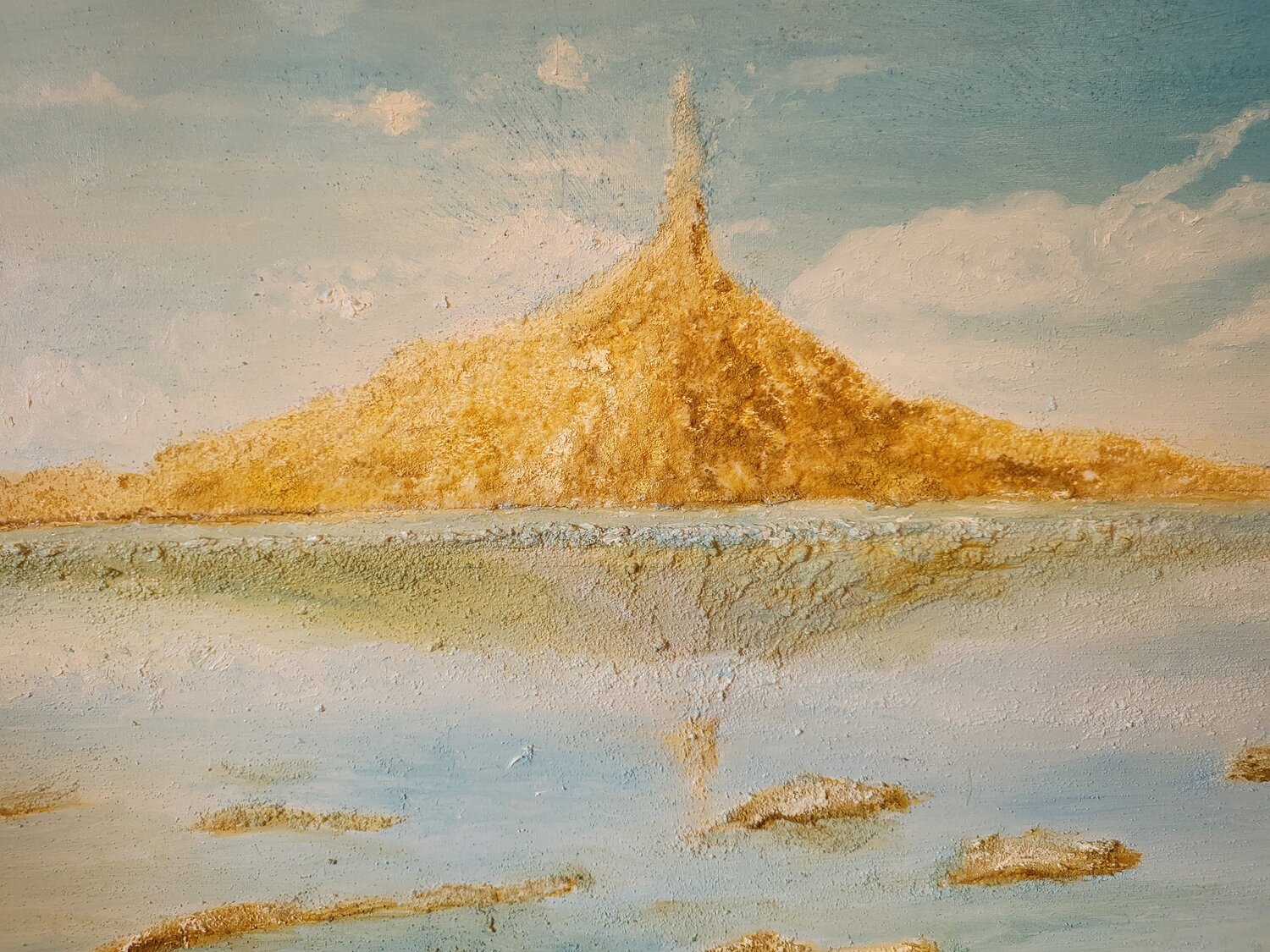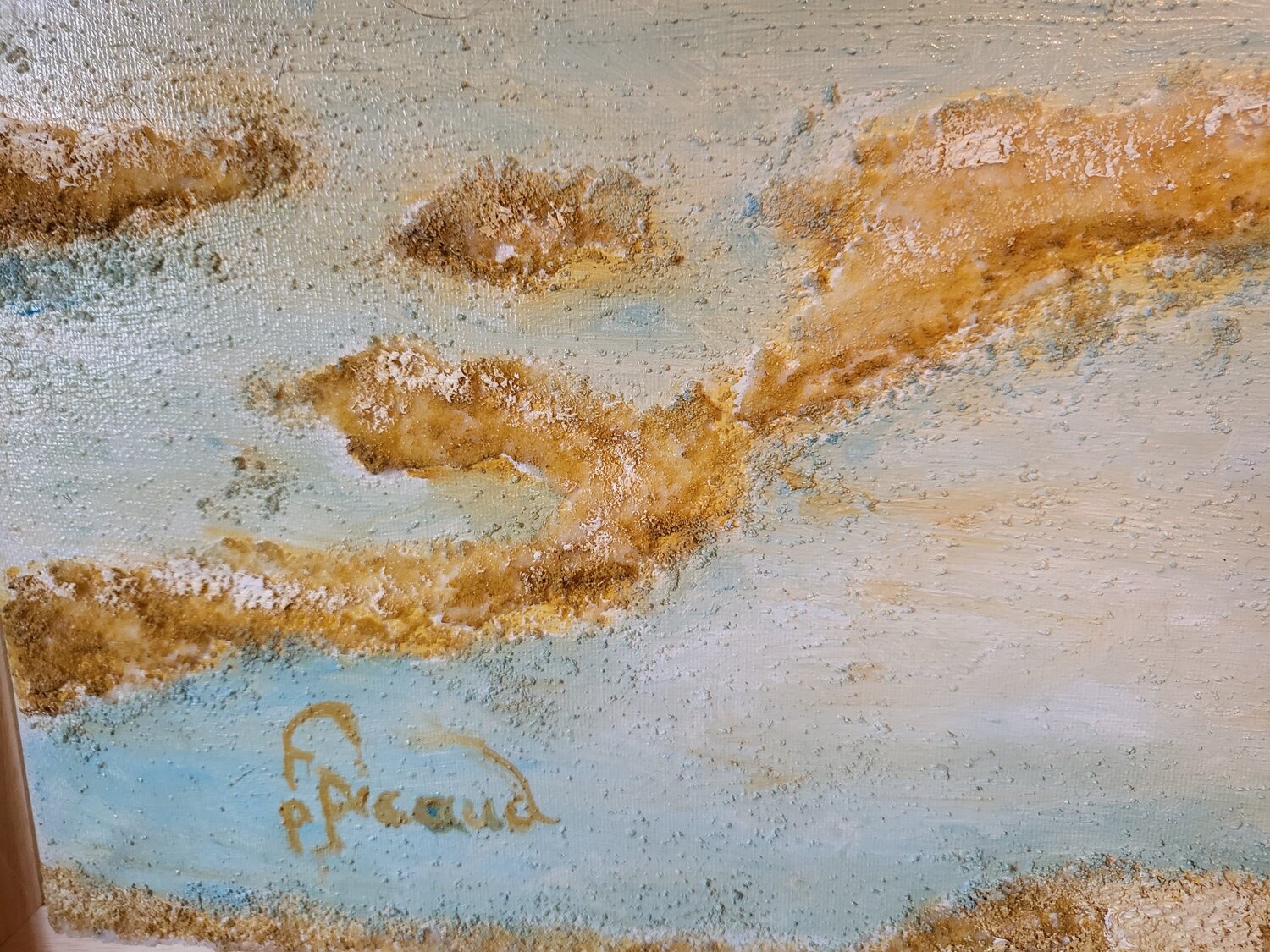 In diesem Werk in Mischtechnik (Sand, Acryl und Öl), das im Grand Palais (Kunsthauptstadt 2026) präsentiert wurde, versuchte ich, durch eine geheimnisvolle, von Licht und Stille erfüllte Insel die vier grundlegenden Elemente einzufangen, die uns erhalten. Um dies zu erreichen, kombinierte ich Impressionismus und Surrealismus, um einen Ort zu evozieren, der einem wachen Traum, einem vertrauten Fleckchen Erde oder gar einem Déjà-vu-Erlebnis gleicht.… Diese Leinwand lädt zur Kontemplation ein und lässt Sie dem Wind lauschen, wie er Salz- oder Sonnenstrahlen auf Ihre Haut zaubert und Ihrer inneren Welt Ruhe und Faszination schenkt. Tauchen Sie ein in ihre Schönheit.