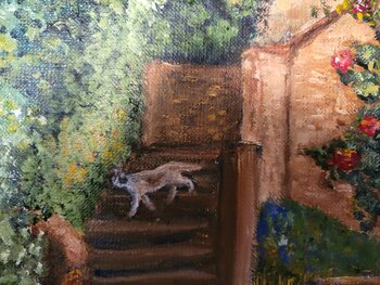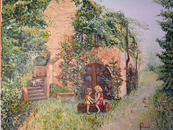 Hier wollte ich die süße Unschuld eines schwebenden Augenblicks einfangen, in dem Natur, menschliche Zärtlichkeit und kindliche Handlungen leicht miteinander verschmelzen. Durch meine impressionistischen Ölgemälde habe ich ein warmes Licht voller Leben und einfacher Emotionen geschaffen. Diese Szene lädt zur Gelassenheit, der Schönheit kleiner gemeinsamer Freuden und dem Frieden ein, den man in der Nähe eines einladenden Zuhauses empfindet.