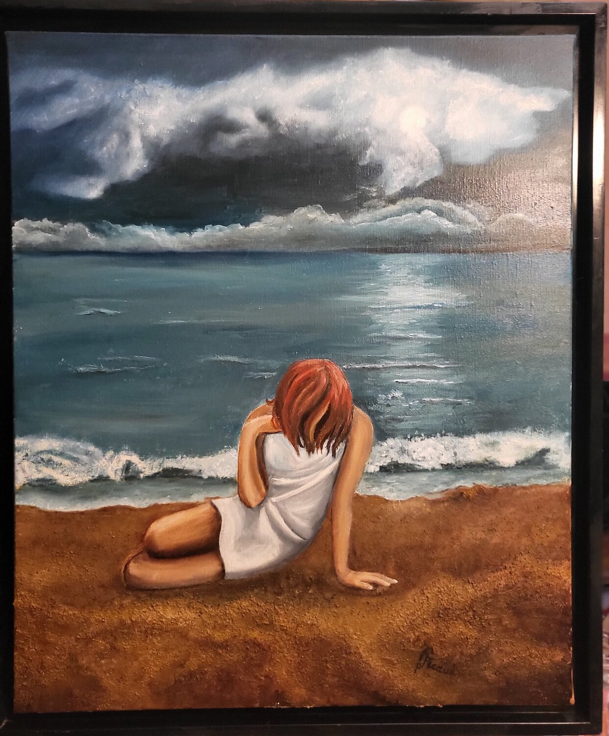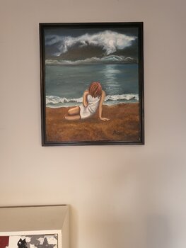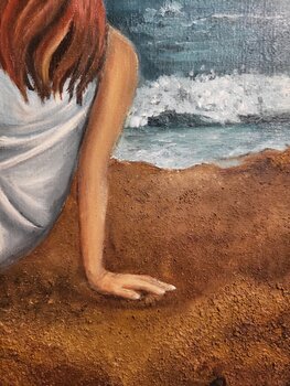 In diesem Werk wollte ich die Intensität eines zwischen Himmel und Meer schwebenden Augenblicks einfangen. Mit Öl und Sand versuchte ich, Materie mit Emotion zu vermischen und so die menschliche Zerbrechlichkeit angesichts der Unermesslichkeit zu symbolisieren. Die uns zugewandte Figur lädt uns ein, unserer Fantasie freien Lauf zu lassen, uns innerlich zu meditieren und Raum für Interpretation zu lassen. Diese Szene vermittelt eine sanfte und tiefe… Energie, die dazu einlädt, in den eigenen Raum zu entfliehen.