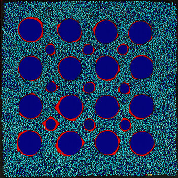 Dieses Werk entfaltet eine imaginäre Kartografie, in der tiefblaue Kreise, umgeben von einem leuchtenden Rot, wie ein Archipel in einer perlmuttfarbenen Nacht schweben.