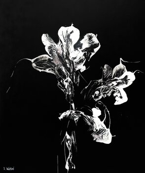 Weiße, pastos gemalte Blüten heben sich von einem in tiefem Schwarz gemalten Hintergrund ab und werden so in ihrer Abstraktion zum Blickfang in dieser Bildkomposition. Dieses Gemälde besticht gekonnt durch die mutige, impulsive Pinselführung der Künstlerin und die dadurch erfahrbare Energie, die so auf die Leinwand gebannt wurde. Die abstrakten Blütenblätter sind wie in Licht getaucht und reflektieren scheinbar einen imaginären Vollmond - der in… den Ritualen und Zeremonien vieler Kulturen eine zentrale Rolle spielte - der sich dem Betrachter jedoch entzieht. Allein der Titel des Gemäldes " Midnight Disguise " weist auf die mitternächtliche Stunde hin und erinnert gleichzeitig daran, was dem Menschen im Dunkel des Nicht-Wissens verborgen bleibt. Die Künstlerin wollte in diesem Gemälde, so wie auch bei dem Gemälde " Full Moon" künstlerisch das Thema des Wandels aufgreifen und hat dies malerisch in ihrem unverkennbaren Stil ausgedrückt.