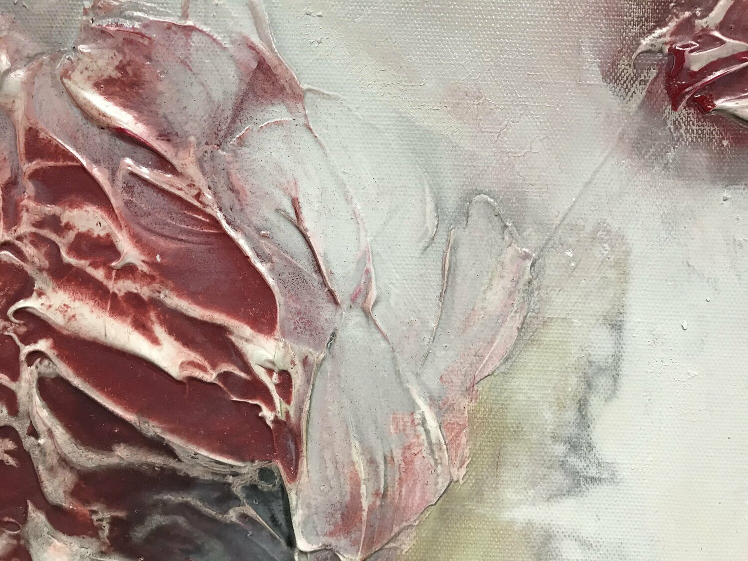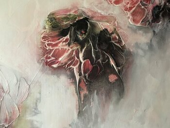 Die Gefühle von tiefer Ruhe und Entspannung, die uns in diesen herausfordernden Zeiten oft fehlen und die doch so wichtig für unser Wohlbefinden sind, inspirierten die Künstlerin zu diesem Gemälde. In einem ruhigen Moment beinahe zu schweben, leicht und getragen, wie die abstrakten Blüten im ruhigen Weiß, können wir vielleicht in einem Traum - oder dieses Kunstwerk betrachtend. " Suspended in a tranquil moment" lädt den Betrachter ein tief durchzuatmen… und die ruhige, poetische Kraft dieses modernen Stilllebens auf sich wirken zu lassen.