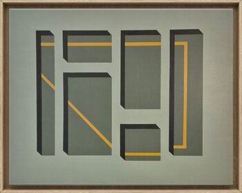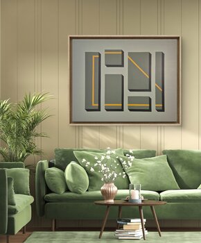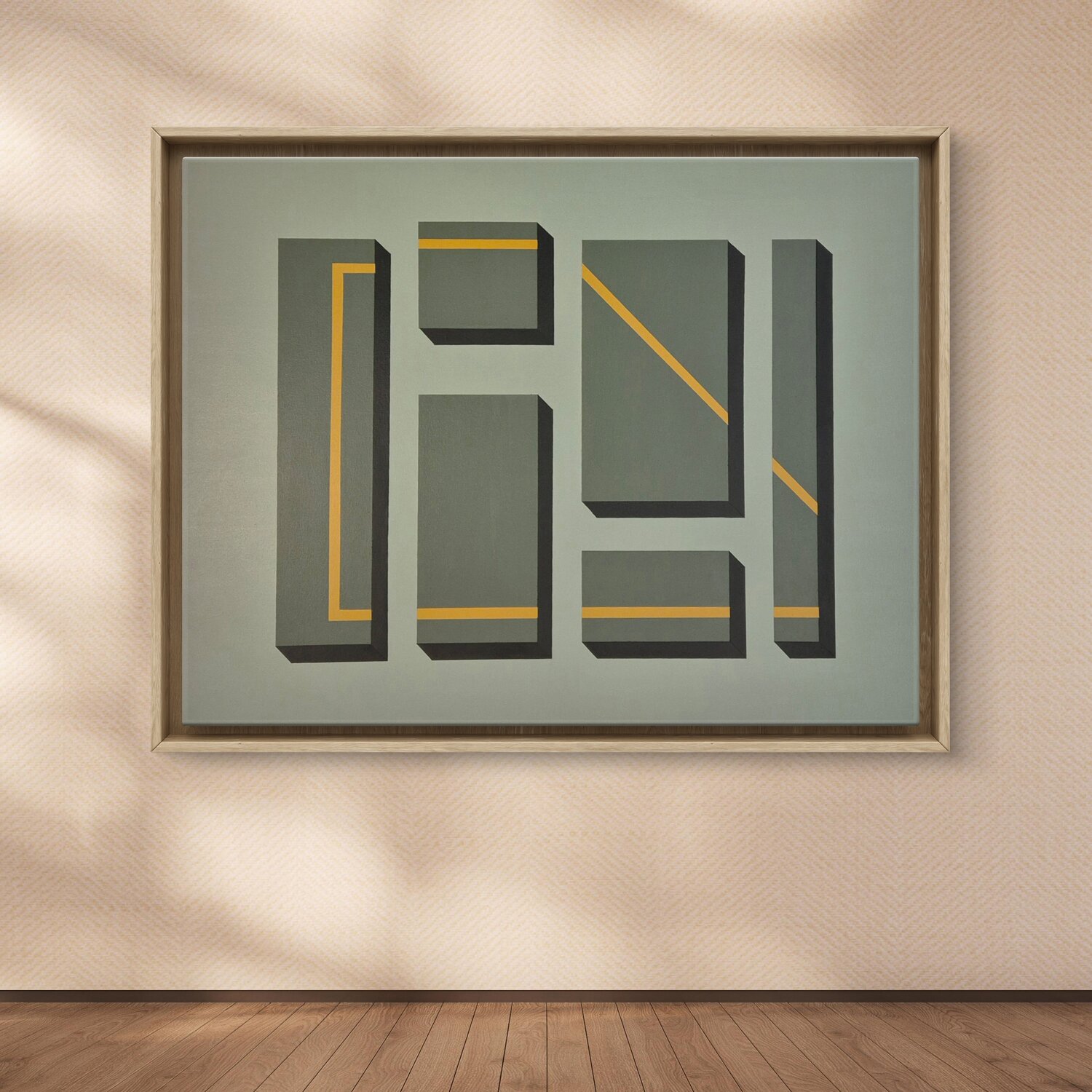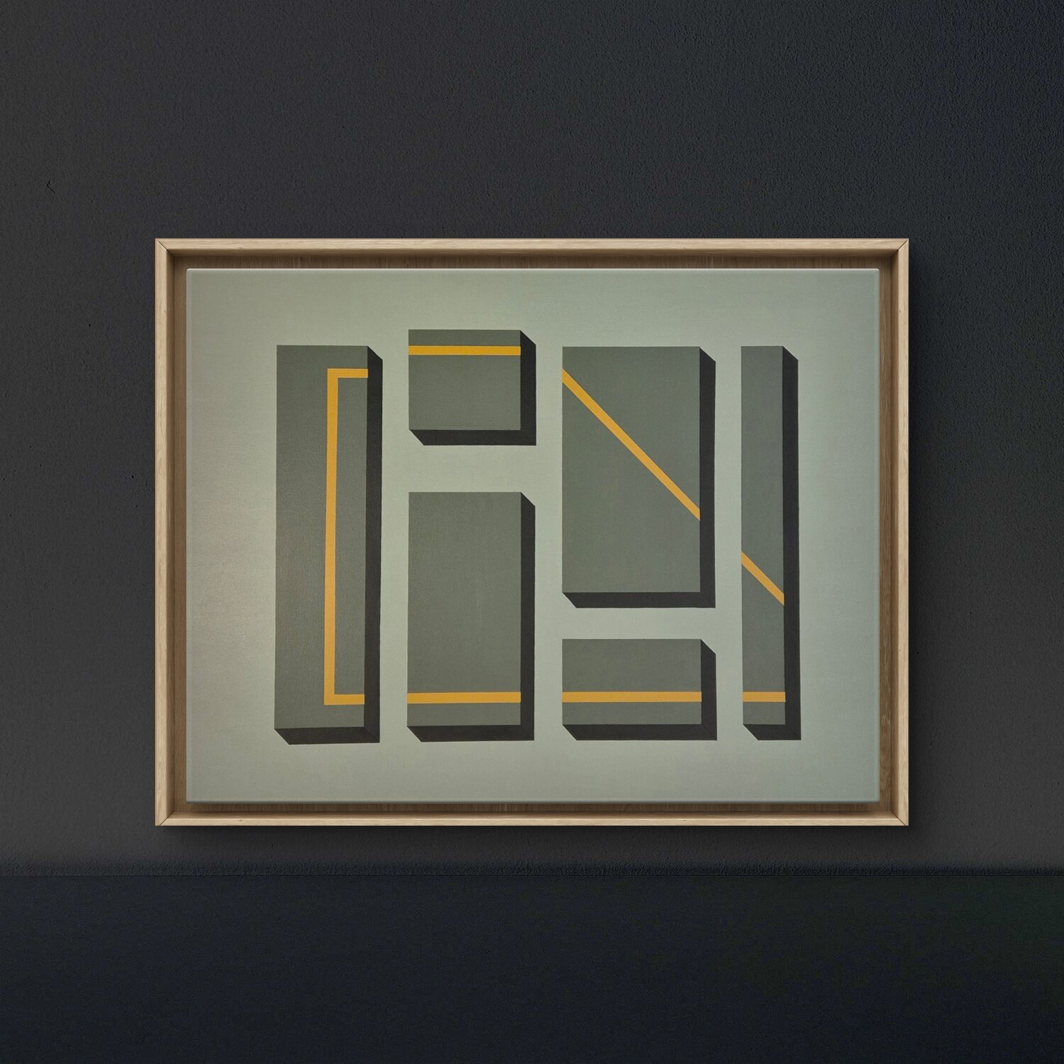 Werk in Ocker und schwarzem Acryl gemalt, schwebender Rahmen aus Eichenholz.