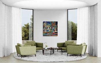 In diesem Werk verschmelze ich Acrylelemente durch sich überschneidende Kreisflächen , um eine semi-abstrakte, surreale Landschaft zu kreieren. Farbenfrohe Segelboote gleiten über das lebendige Meer, umspielt von geheimnisvollen, schwimmenden Formen, die Träume und das Unbewusste symbolisieren. Dieses Gemälde ist ein visuelles Gedicht der Freiheit und der unergründlichen Tiefen unserer Seele, das den Betrachter auf eine unvergessliche Reise mitnimmt.… Es belebt jeden Raum mit seiner Energie und Farbvielfalt – ein echter Blickfang!