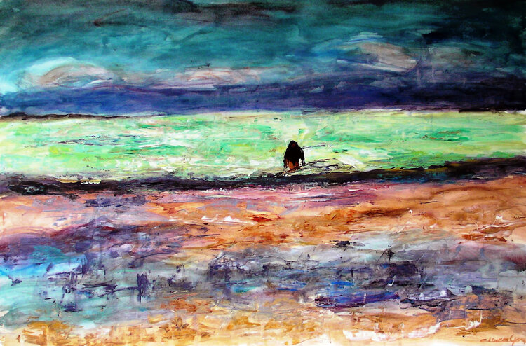 In diesem expressionistischen Acrylgemälde fange ich die Einsamkeit und Weite der Natur ein. Die lebhaften und schwungvollen Striche erinnern an die raue, stürmische Schönheit des Meeres und des Himmels. Eine einsame Gestalt sitzt nachdenklich da und erinnert uns eindringlich an unsere eigene Kleinheit im Vergleich zur Majestät der Natur. Dieses Werk lädt Sie zur Besinnung und Gelassenheit in Ihren Raum ein und verschmilzt nahtlos mit den Elementen… und Emotionen Ihres Zuhauses.