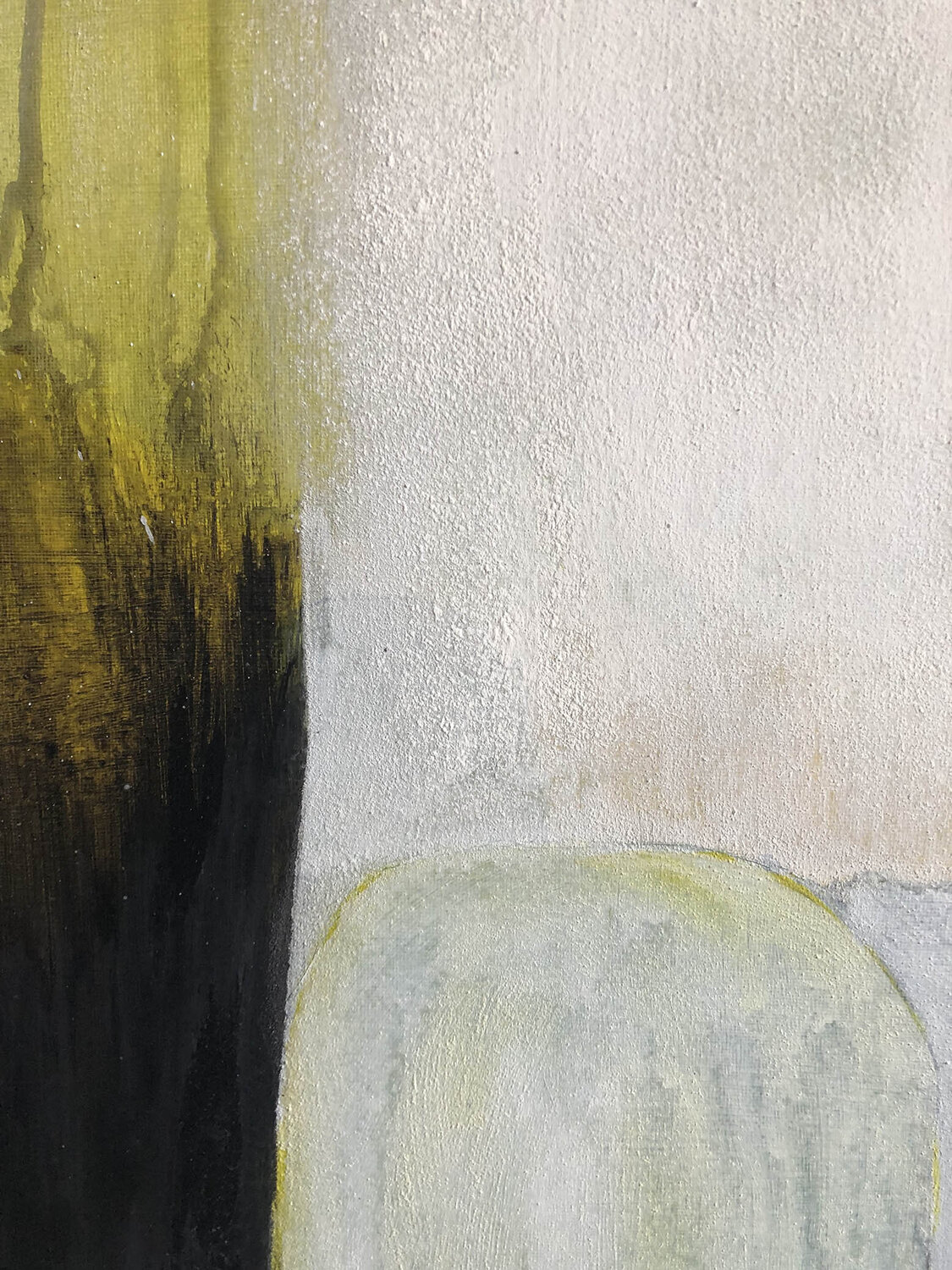 In dieser Arbeit verdichten sich die Spuren aus gestischen Linien. Dunkle Farbflächen und zeichnerische Elemente überlagern sich und bilden eine bewegte Struktur, die sich eine zentrale vertikale Form organisiert.
