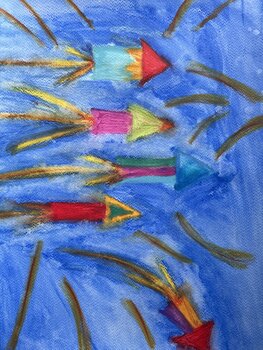 In diesem Fingergemälde habe ich mit Abstraktion und Figuration gespielt, um ein Gefühl unschuldiger und hoffnungsvoller Freude auszudrücken. Die abstrakten Formen, die an Feuerwerk oder Häuser auf hohen Stängeln erinnern, laden zum Träumen und zum Überwinden irdischer Grenzen ein. Die lebendigen, warmen Farben kontrastieren mit dem ruhigen blauen Hintergrund und erzeugen eine positive Energie, die den Geist belebt und zum Lächeln einlädt. Es ist… eine Feier des Lebens und der unendlichen Möglichkeiten, die sich uns eröffnen, wenn wir nur den Blick darüber hinaus wagen.