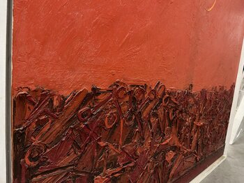 Auf dieser großformatigen Leinwand stellt Gastone Cecconello eine komprimierte und in Schubladen gesteckte Menschheit dar, die er mit seinen unverwechselbaren „stilisierten Hominiden“ wiedergibt. Die dichte, materielle rote Masse nimmt die Basis der Komposition ein, während darüber ein in glühendem Rot leuchtender Himmel dominiert, der von einer dünnen Mondsichel erhellt wird.