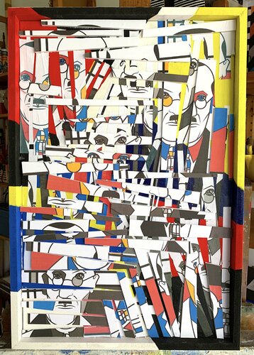 Die Formen und Farben werden allmählich auf ihren einfachen Ausdruck reduziert. Finden Sie die Fragmente des Gesichts, begleitet von Primärfarben, mehr Schwarz und Weiß, die mit Linien, Quadraten und Rechtecken verbunden sind. Ausgehend von dem Bild von Piet Mondrian, Rekonstruktion durch Ausschnitte aus kleinen Papierstücken, Federbrett (0,3 - 0,5) dick, Pappe nebeneinander oder übereinander gelegt. Von der geordneten Konstruktion bis zum Chaos… durch die verschiedenen Variationen, die der Blick erkennt und zum Leben erweckt.