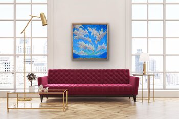 In diesem Stück wollte ich die lebendige Essenz eines flüchtigen Moments einfangen, wenn sich der Himmel im Morgengrauen verwandelt. Ich habe mit Öl im impressionistischen Stil gearbeitet, kräftige Striche übereinander gelegt und mit dem Spektrum von Blau- und Weißtönen gespielt,… um ein Gefühl der Erbauung und grenzenlosen Möglichkeiten hervorzurufen. Es ist eine visuelle Symphonie aus Licht und Luft, die jeden Raum, den sie bewohnt, inspirieren und erfrischen soll.