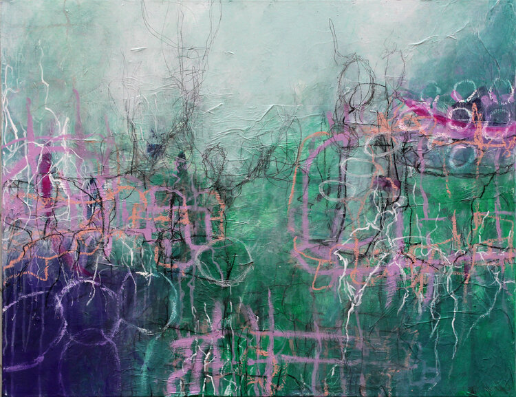 Das Acrylbild "Frühlingswäldchen" zeigt die stille und zarte Stimmung des nahenden Frühlings. Das helle Grün symbolisiert die erste sprießende Vegetation, welche sich aus dem dunkellila Grund erhebt. Das Sonnenlicht fällt durch den noch kargen Wald. Über die Bildfläche verteilen sich abstrakte Zeichnungen von unterschiedlichen Blatt- und Pflanzenformen sowie Spuren in Rosé und Weiß. Sie vermitteln Vogelgezwitscher und buntes Treiben – ein intensiver… Moment des Erwachens.
