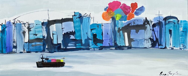 In dieser Arbeit habe ich Acryl mit Emaille verschmolzen, um die Schnittstelle zwischen Urbanem und Organischem zu erkunden. Durch den halbabstrakten und expressionistischen Stil versuche ich, die vergängliche Schönheit der am Himmel hängenden Blumen einzufangen, einen poetischen Kontrast zur Silhouette der Stadt. Es ist ein visueller Dialog über das Zusammenleben von Natur und menschlicher Schöpfung, eine lebendige und emotionale Erinnerung für… Ihr Zuhause.