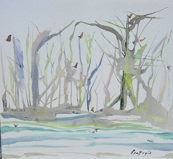 In dieser Arbeit habe ich Acryl und Emaille verwendet, um fließende und dynamische Texturen zu erkunden, die die Essenz des Expressionismus und Semiabstraktionismus einfangen. Es stellt eine Widerspiegelung der Natur und menschlicher Emotionen dar, in der kahle Bäume und fließende Gewässer miteinander verwoben sind. Meine Absicht war es, eine ätherische Atmosphäre zu schaffen, die den Betrachter einlädt, sich in einer Landschaft stiller Kontemplation… zu verlieren und eine tiefe Verbindung mit der natürlichen Umgebung und seinen inneren Emotionen zu fördern.